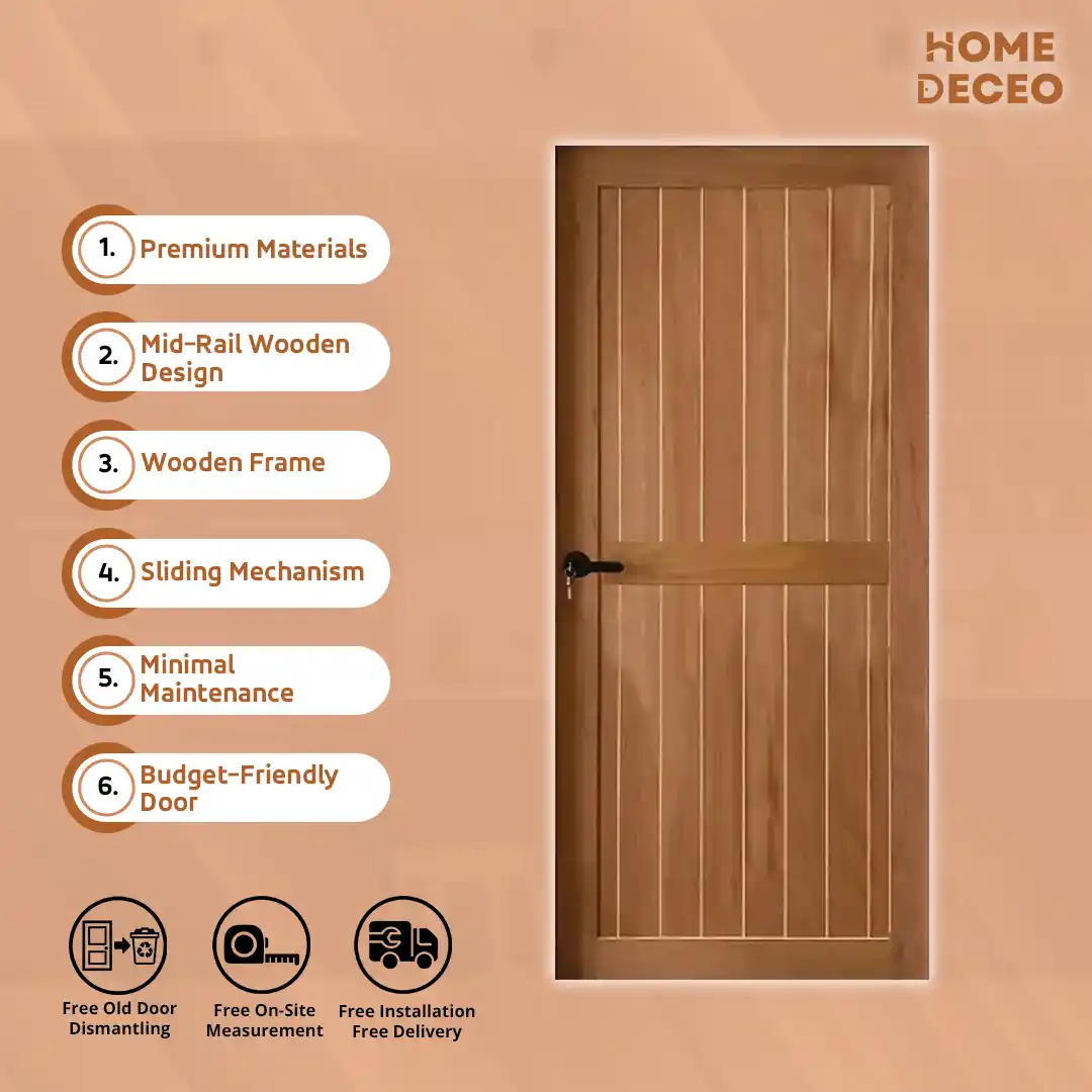 The Framed Mid Rail Barn Door features a mid-rail frame design that combines strength and style. Its laminate finish ensures durability, smooth sliding, and easy maintenance, perfect for bedrooms, kitchens, or living areas.